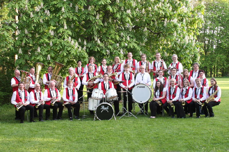 Mitglieder (inklusive Dirigent), darunter vier Jugendliche, die sich