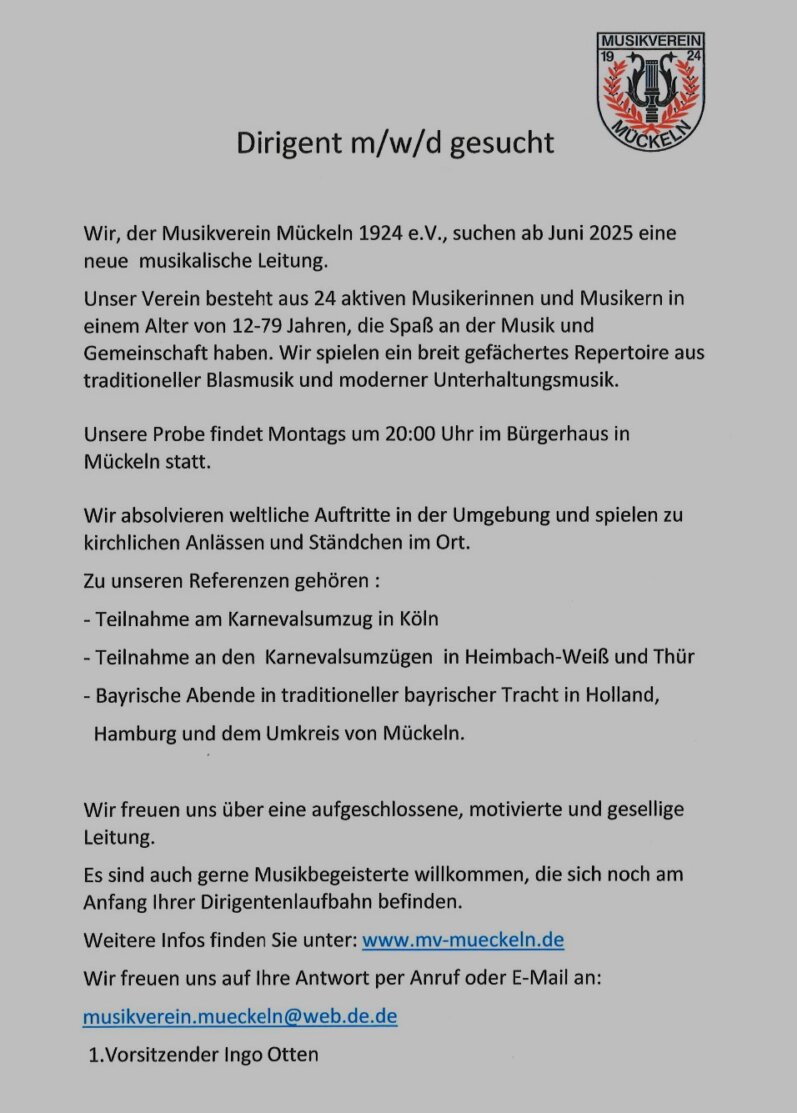 wir wollen das Medium Internet gezielt dazu nutzen, um Ihnen möglichst viele Informationen in gebündelter Form über unseren Musikverein Mückeln zu geben. Unsere Web-Seiten sollen Ihnen als Orientierung und als Wegweiser dienen. Selbstverständlich kann aber eine Homepage nicht alles Wissenswerte vollständig und lückenlos enthalten und leider auch nicht allen Wünschen und Ansprüchen in vollem Umfange gerecht werden. Durch regelmäßige Fortschreibungen und Ergänzungen möchten wir unsere Seiten aber immer möglichst aktuell halten.